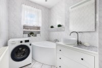 Parter (120,55m2): kuchnia, dwa pokoje, łazienka z WC, holl + garaż w bryle budynku (35,45) oraz pralnia;