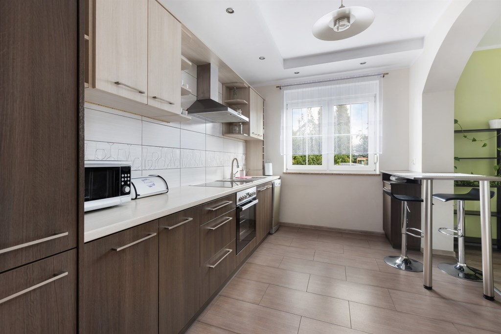 Ściany – gładź gipsowa, płytki ceramiczne w łazienkach i kuchni;