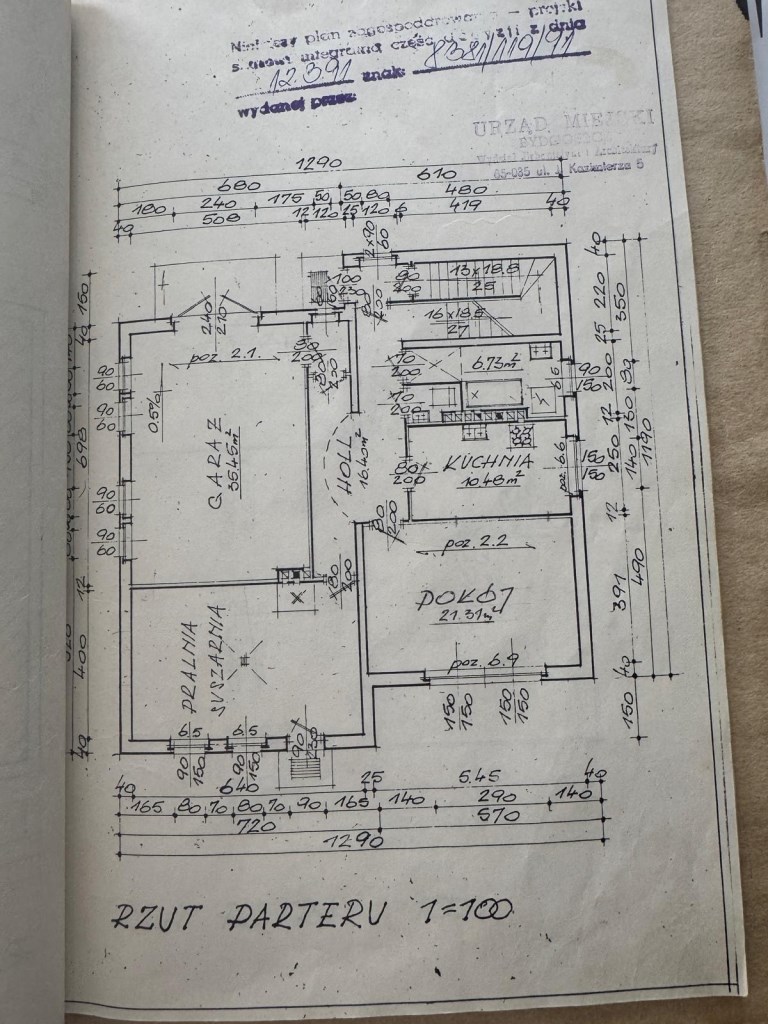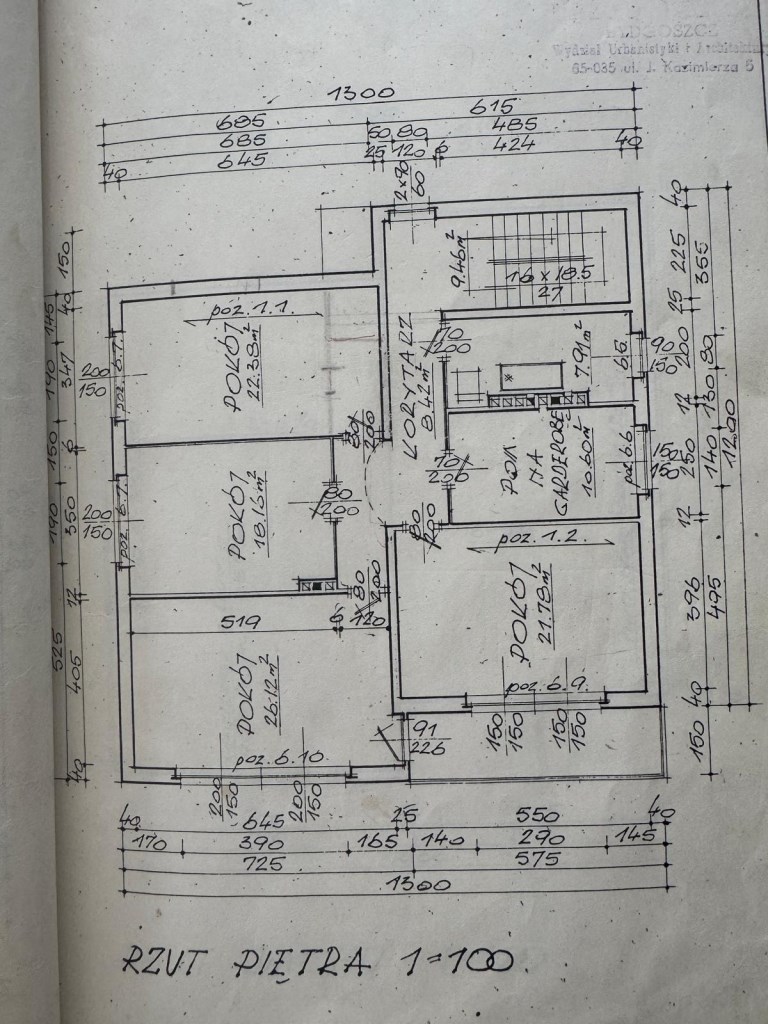 Piętro (156m2): kuchnia, łazienka z WC, cztery pokoje, łazienka z WC, spiżarnia, holl.