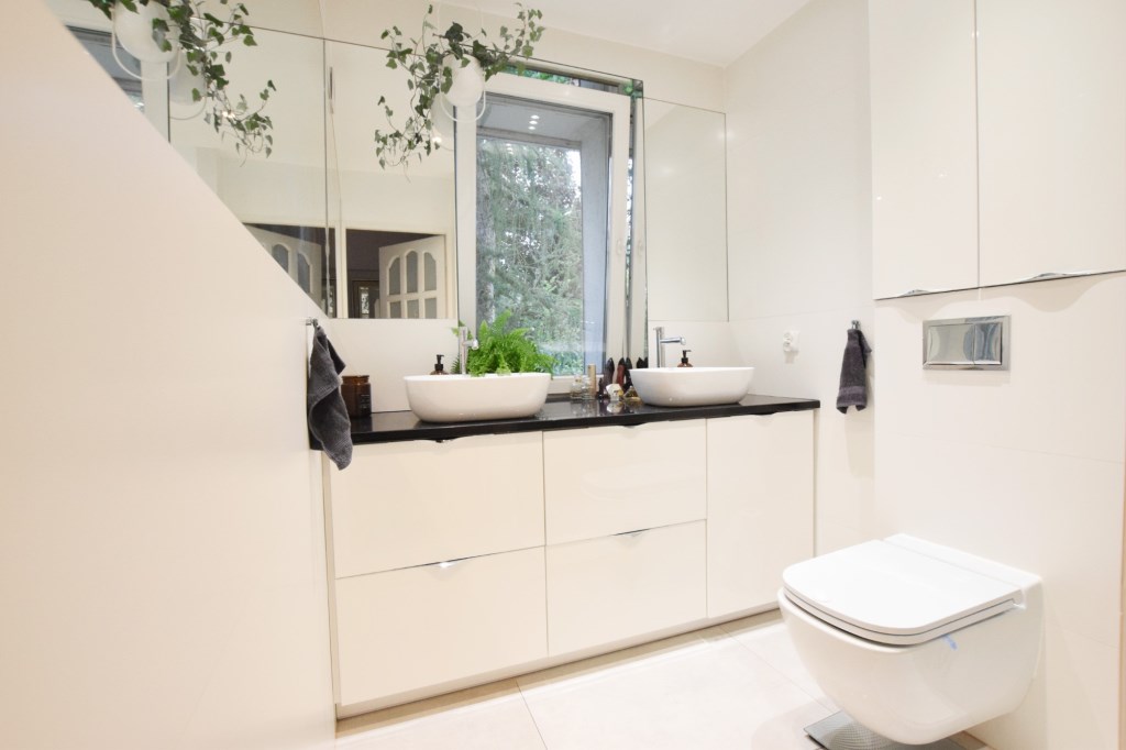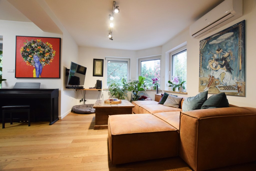 Dodatkowe instalacje: panele fotowoltaiczne na dachu, instalacja klimatyzacji z funkcją grzania i chłodzenia – w salonie na parterze i w sypialniach na piętrze.