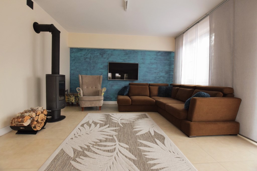 Parter: przestronny salon połączony z jadalnią i aneksem kuchennym z wyjściem na taras, łazienka z wc, hol, wiatrołap