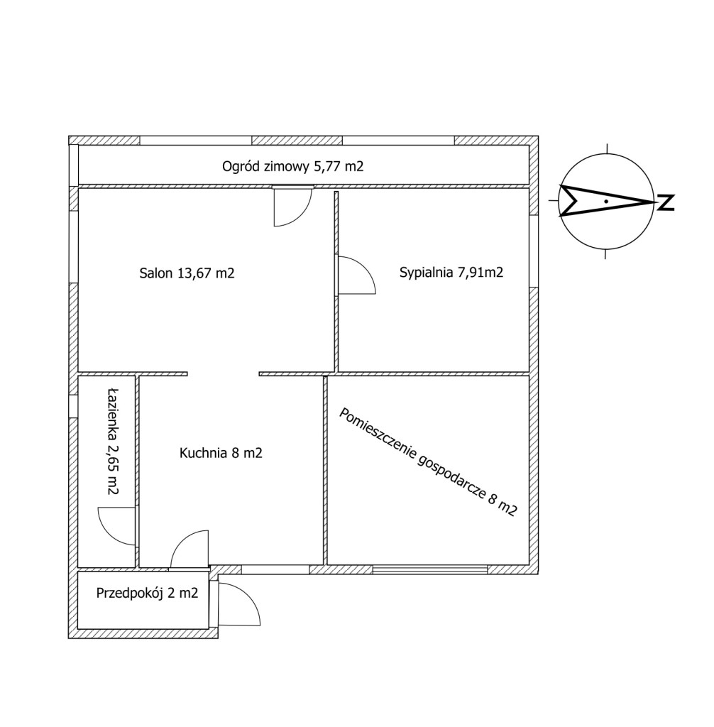 Salon z wyjściem na ogród zimowy, sypialnia, kuchnia, łazienka, pomieszczenie gospodarcze.