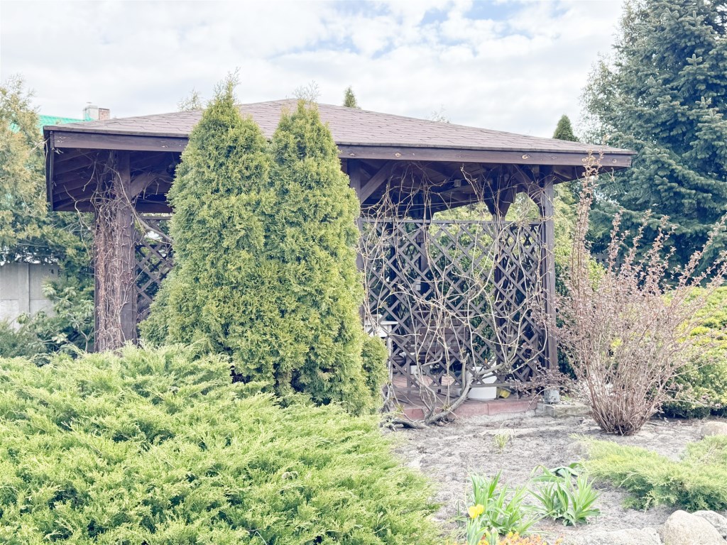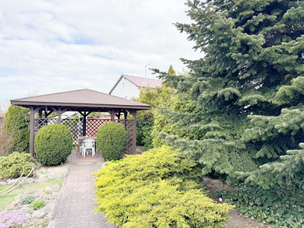 Teren wokół domu jest zagospodarowany (zadaszona altanka, wieloletnie nasadzenia). Zostały wydane również WZ na wybudowanie pomieszczeń gospodarczych.