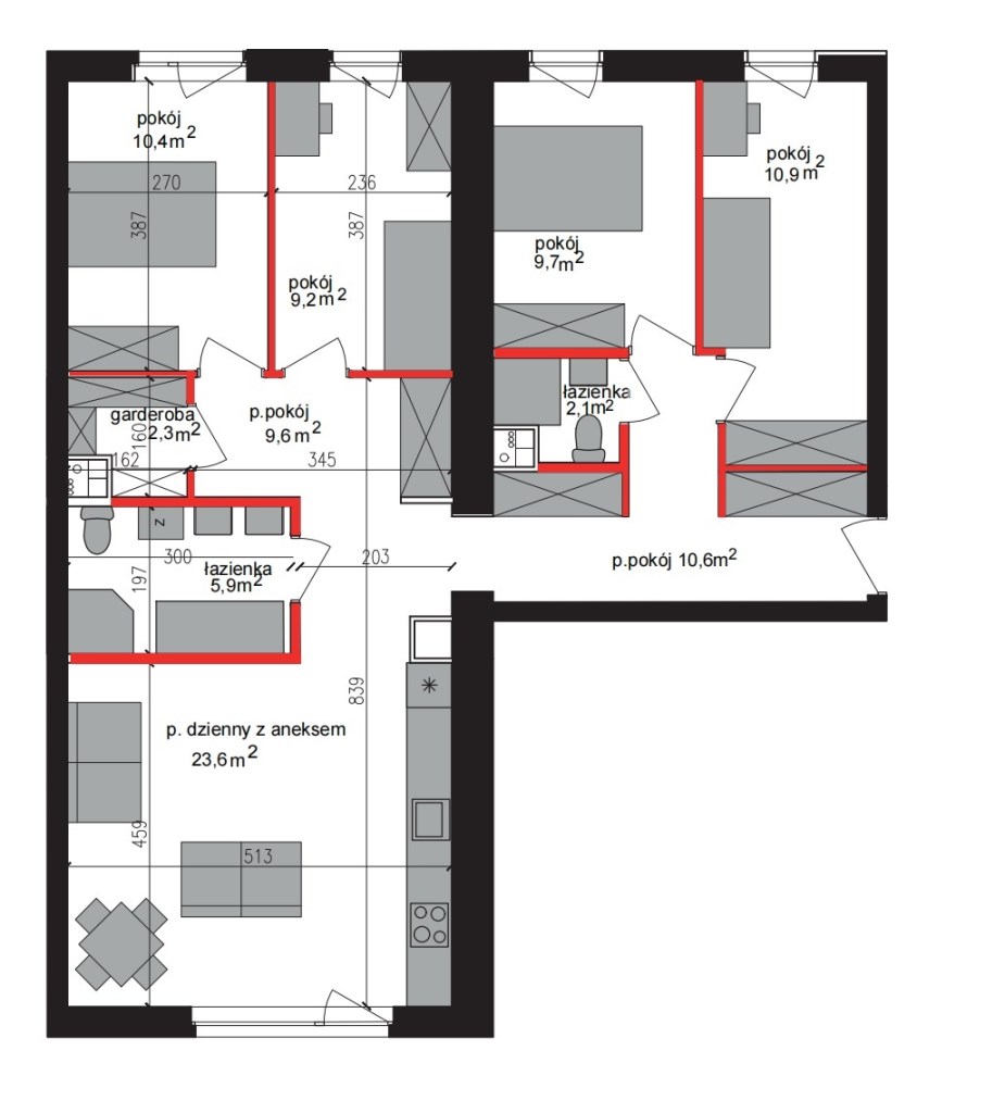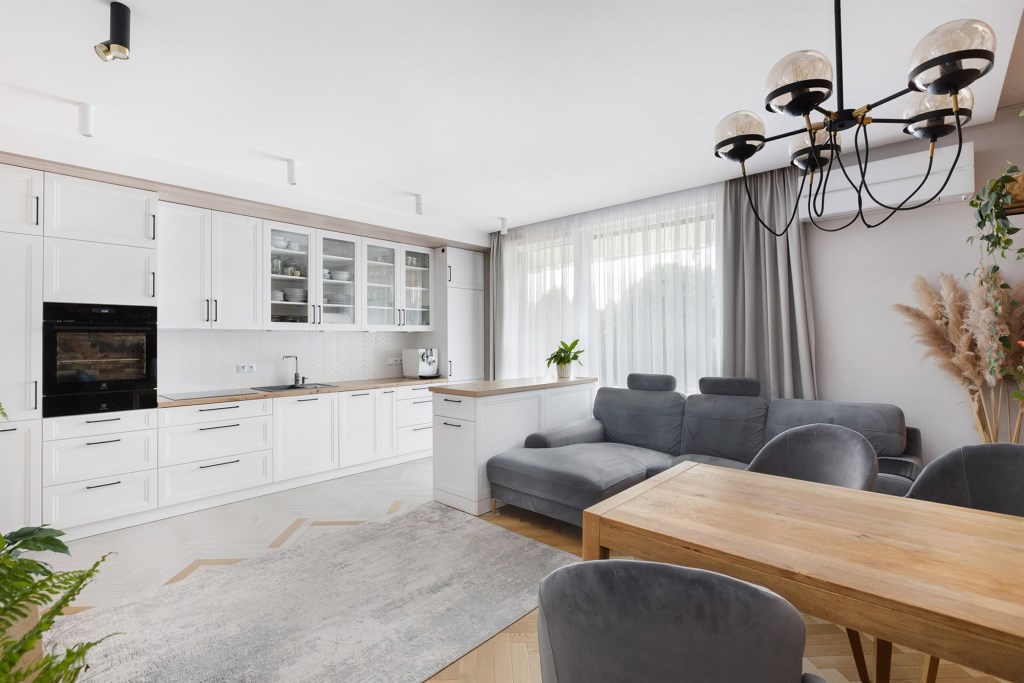 Wyposażenie – zabudowa kuchenna ze sprzętem AGD, szafy wnękowe, łazienka w pełni wyposażona, umeblowanie pokoi.