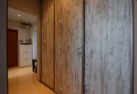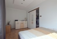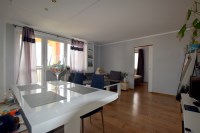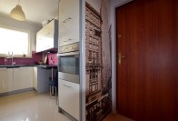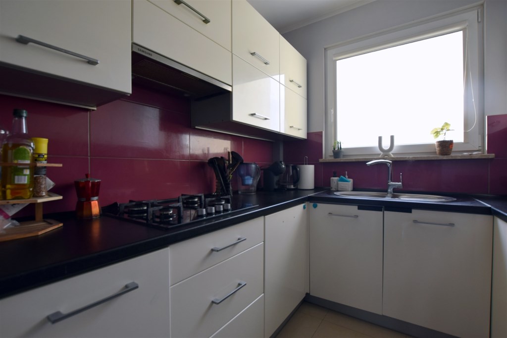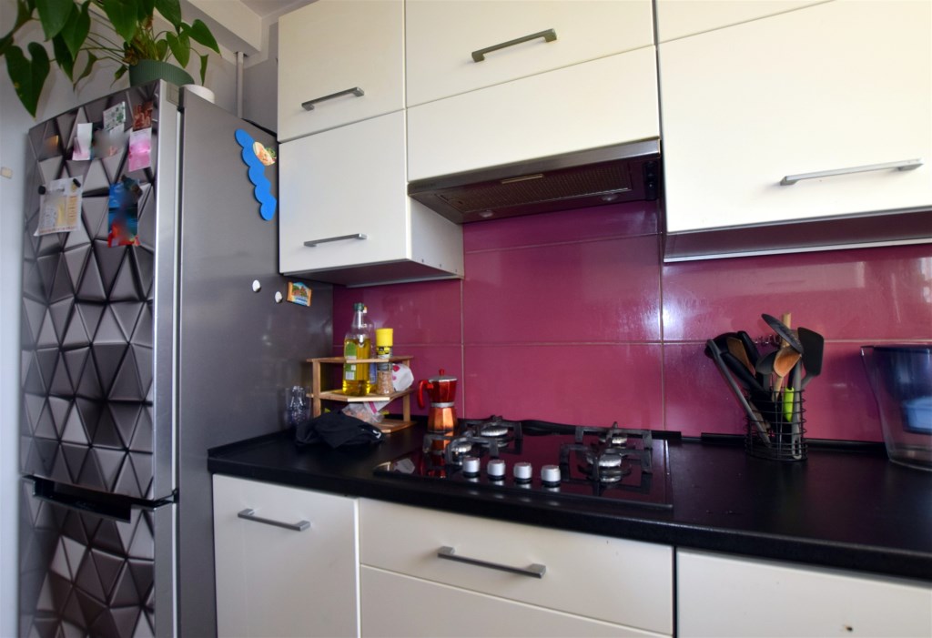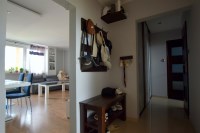 Mieszkanie cżęsciowo przechodnie skłąda się z trzech pokoi, osobnej kuchni, łazienki i wc. Z dużego pokoju wyjście na balkon i przejście do sypialni. Kuchnia w nowoczesnej zabudowie ze sprzętem AGD: płyta gazowa, piekarnik elektryczny, okap, mikrofalówka, zmywarka, lodówkozamrażarka, pralka (ukryta w jednej z szafek). Łazienka z oknem, toaleta osobno. W korytarzu miejsce na odzież wierzchnią i pojemna szafa typu Komandor.