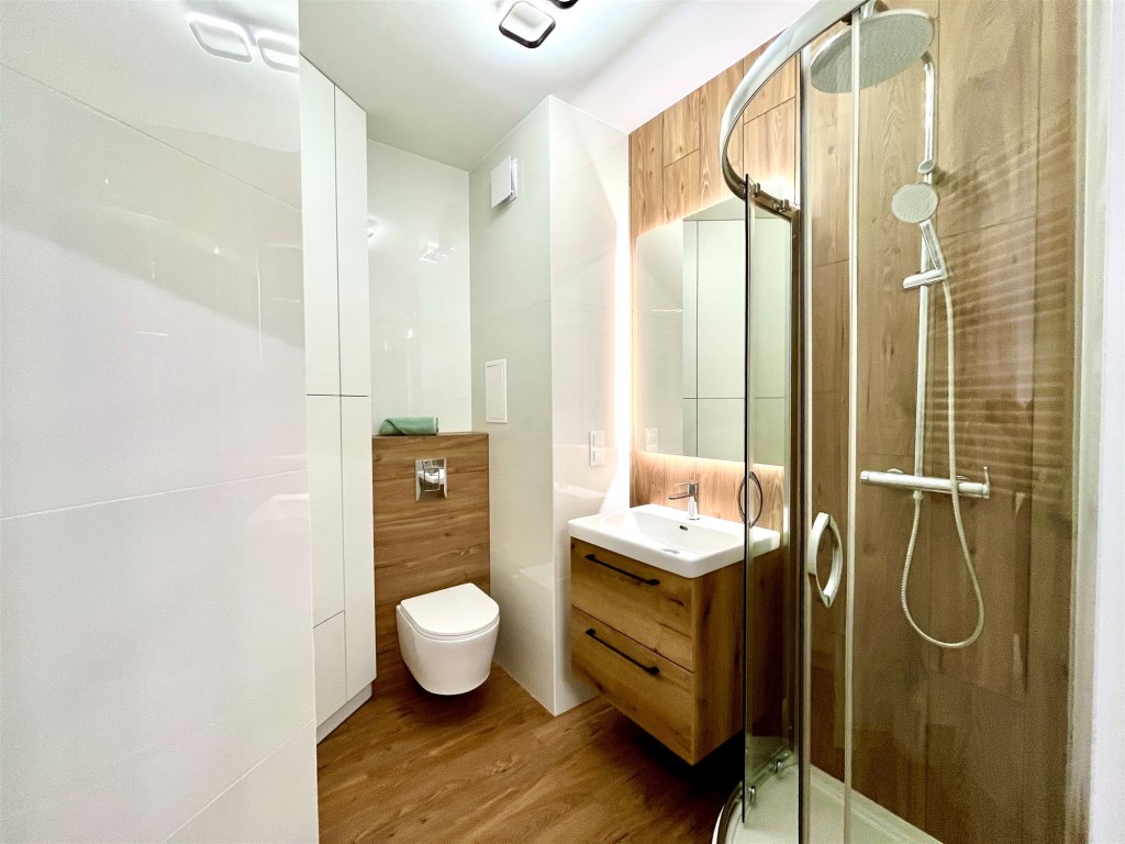 podłogi – panele wysokiej klasy oraz gres w łazience,