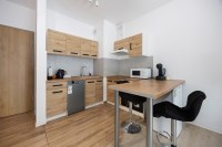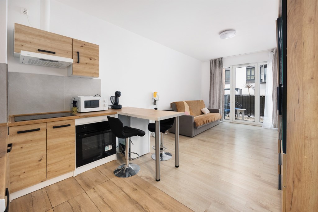 Na wyposażeniu: zabudowa kuchenna z pełnym sprzętem AGD (piekarnik, płyta, mikrofalówka, mała lodówka), łazienka w pełni wyposażona + pralka, w pokoju telewizor, kanapa, szafa.