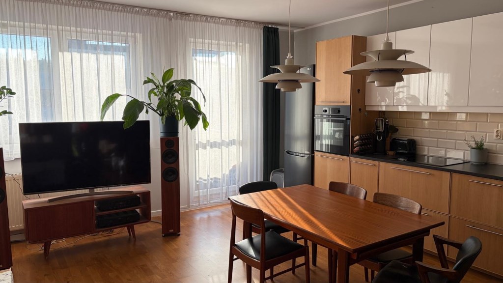 - jasny salon z wyjściem na spory balkon, idealny do relaksu i spotkań z bliskimi,