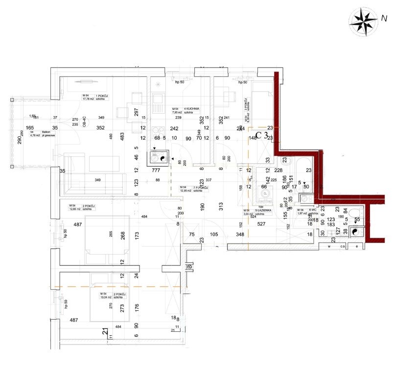 Mieszkanie trzypokojowe (68,55m2) na piątym piętrze w budynku wielorodzinnym zlokalizowanym w Centrum miasta.