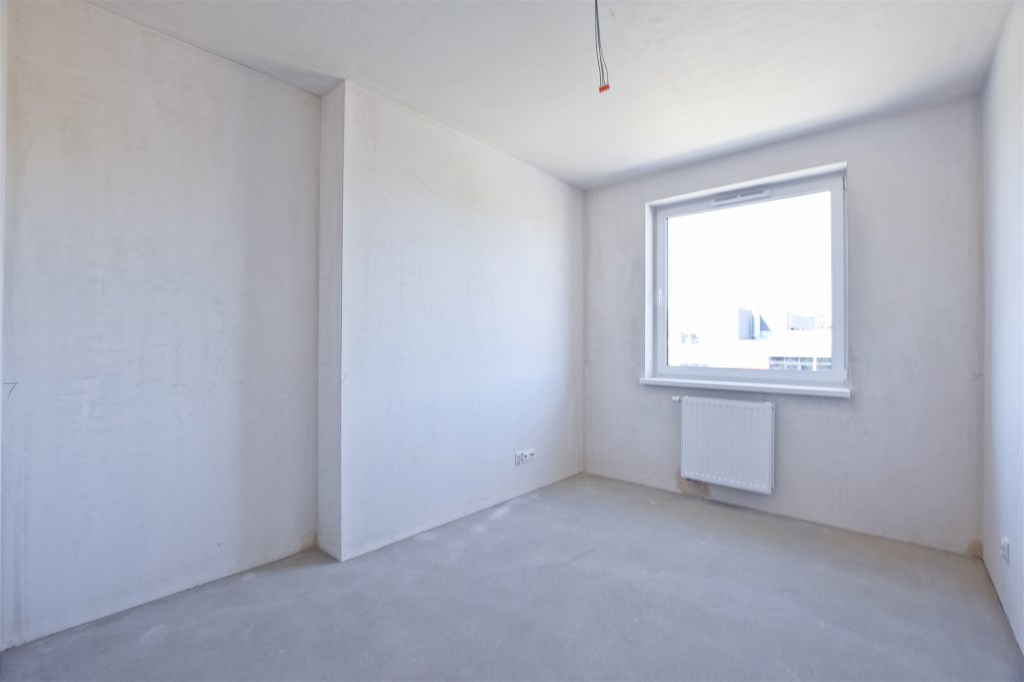 Narożne mieszkanie w stanie deweloperskim składające się z z salonu z aneksem kuchennym z wyjściem na balkon, sypialni, łazienki oraz przedpokoju (z wydzielonym miejscem nasz szafę). Układ pozwala na wydzielenie samodzielnej kuchni oraz dwóch odrębnych pokoi.