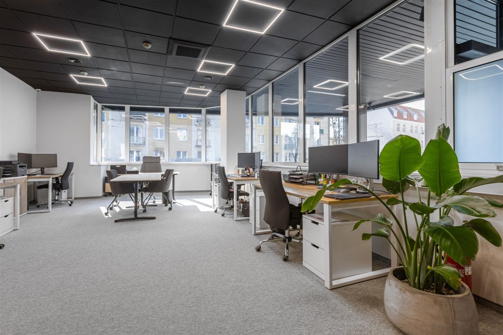 Przy wstępnym podziale w budynku wyodrębniono pomieszczenia o powierzchni od 22m2 do ponad 100m2. Można je ze sobą łączyć, co daje nieograniczone możliwości dla nawet najbardziej wymagających najemców. W częściach wspólnych zaprojektowano i wykończono łazienki oraz pomieszczenia socjalne do dyspozycji najemców (nie wliczane do powierzchni wynajmowanych lokali). Na każdym piętrze zaaranżowano także sale konferencyjne do dyspozycji wszystkich najemców! Budynek został wyposażony w windę, która obsługuje lokale na wszystkich kondygnacjach.