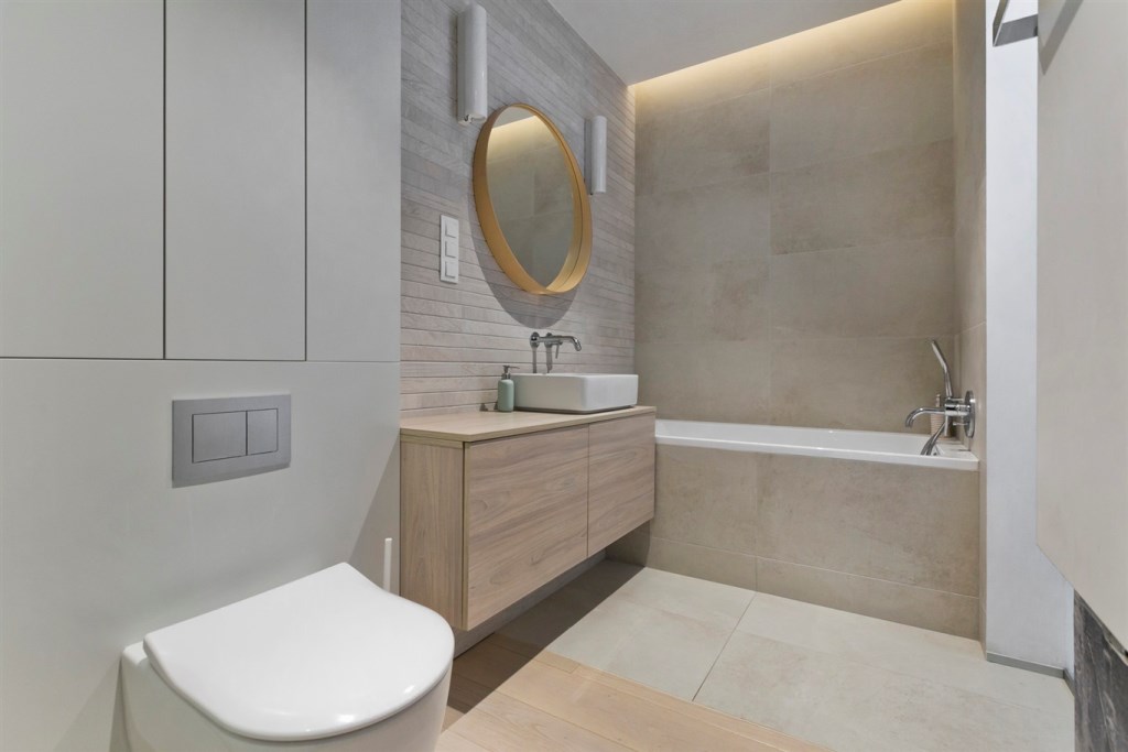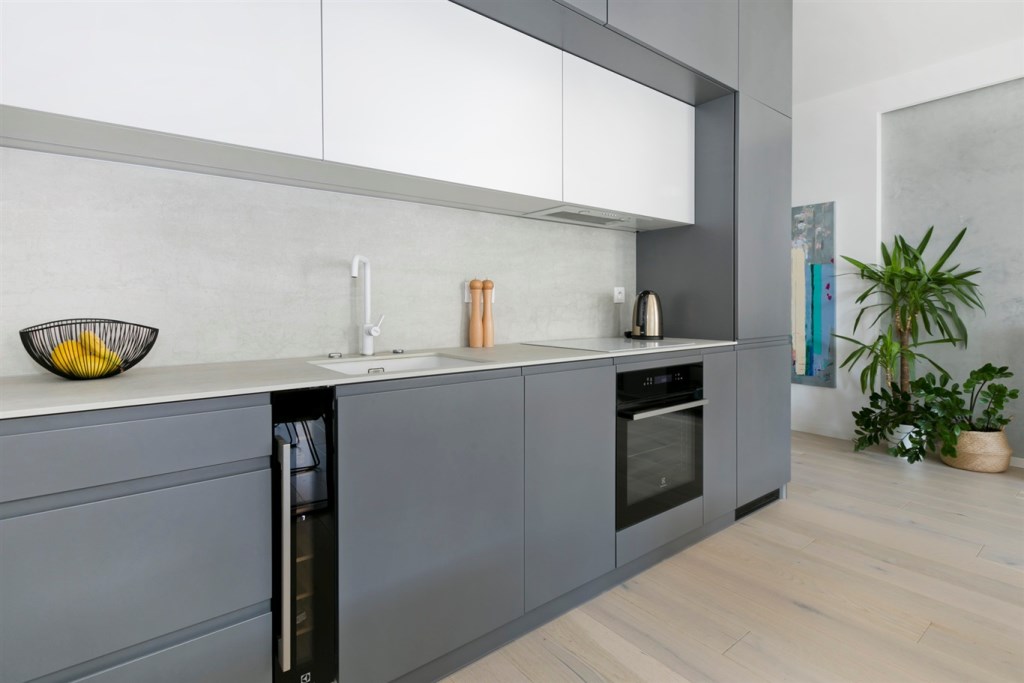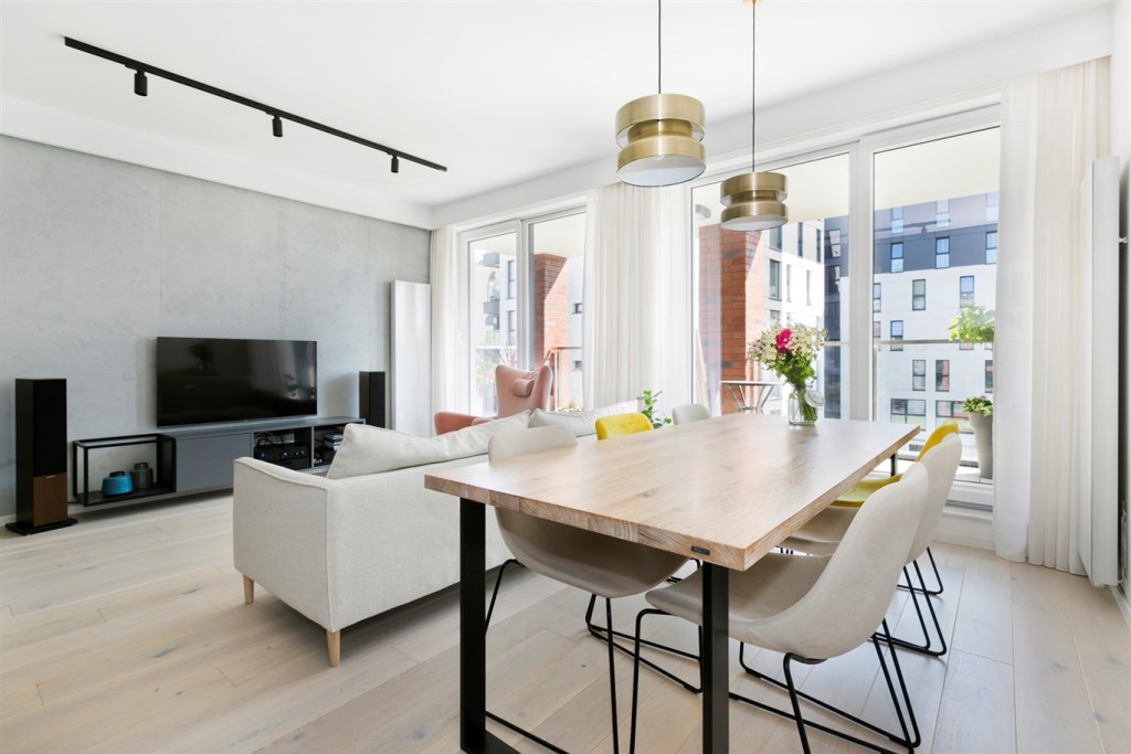 W cenie pozostaje: zabudowa kuchenna ze sprzętem AGD (lodówka, zmywarka, płyta indukcyjna, piekarnik, okap, lodówka na winko), blat ze spieku kwarcowego, łazienka z armaturą i pełnym wyposażeniem, szafy wnękowe wykonane na wymiar; pozostałe umeblowanie - do uzgodnienia.