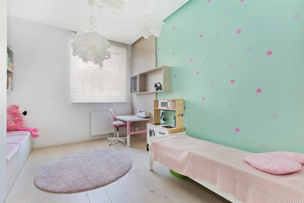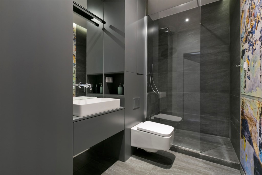 Ściany - gładź gipsowa, tapety dekoracyjne, włoskie gresy w łazienkach, spiek kwarcowy w pasie roboczym w aneksie kuchennym;
