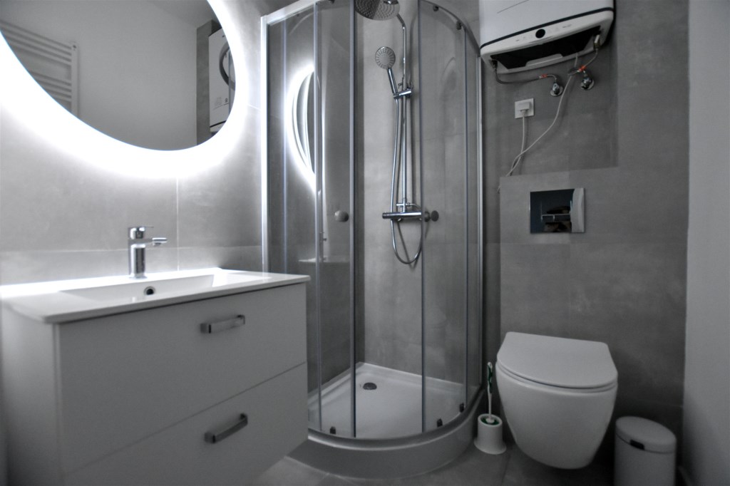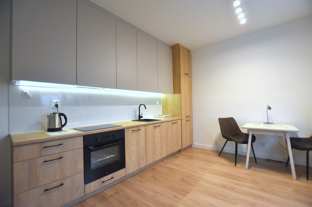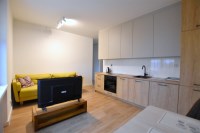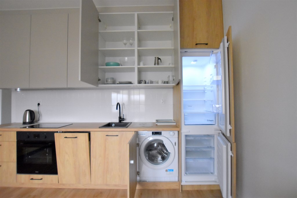 Mieszkanie składa się z pokoju dziennego z aneksem kuchennym, osobnej sypialni oraz łazienki z wc. W aneksie kuchennym sprzęty w zabudowie: lodówka z zamrażalnikiem, pralka, płyta elektryczna, piekarnik, okap. W pokoju NIE rozkładana kanapa, telewizor. W sypialni łóżko, stolik nocny i dwie komody. W korytarzu pojemna szafa.