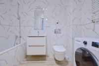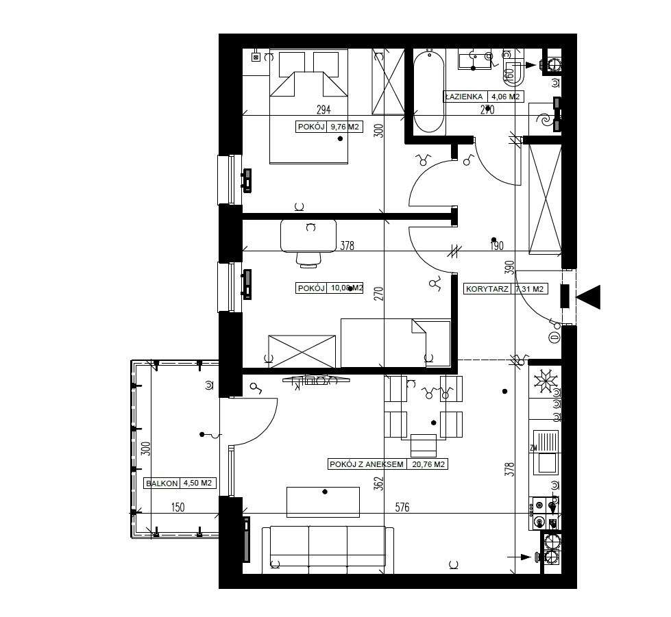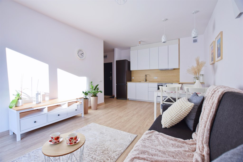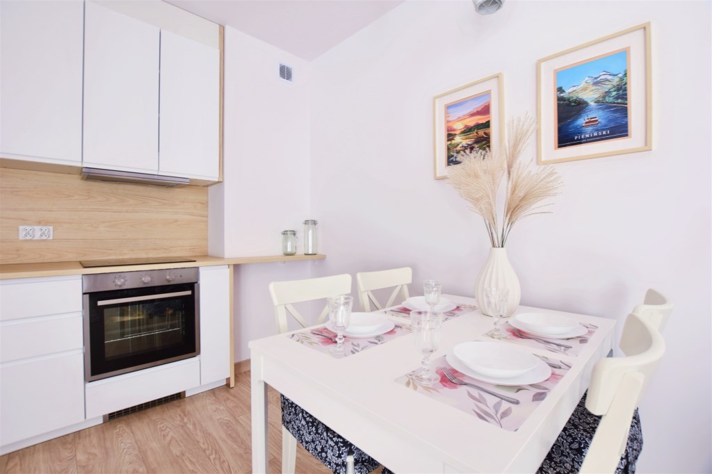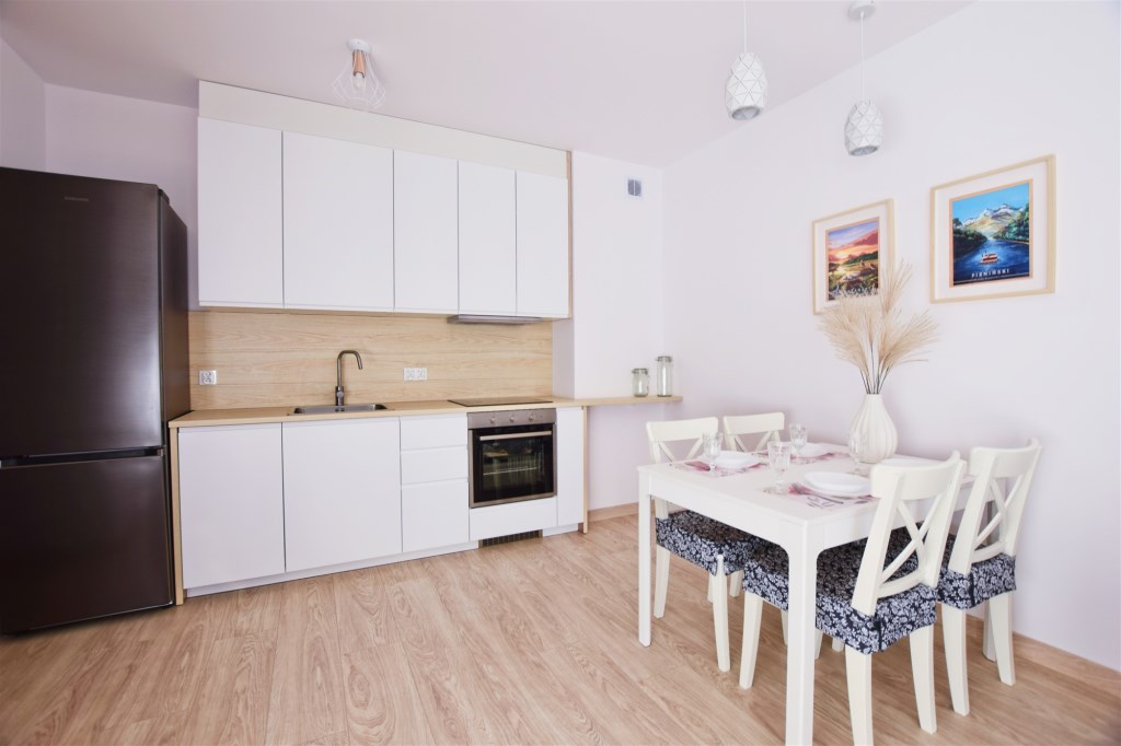 W cenie pozostaje: zabudowa kuchenna z pełnym AGD (lodówka, zmywarka, piekarnik, płyta indukcyjna, okap), ponadto rozkładana sofa z funkcją spania, stół z krzesłami, szafka RTV; pojemna szafa trzydrzwiowa w przedpokoju; łazienka z wanną z funkcją prysznica oraz pralką, meble w sypialniach.