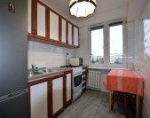 W kuchni zabudowa szaf ze sprzętem AGD: duża lodówka z zamrażalnikiem, kuchenka gazowa, piekarnik elektryczny, okap, mikrofalówka. W korytarzu duża szafa ubraniowa i wieszak na odzież wierzchnią. W dużym pokoju stolik kawowy, w mniejszym biurko.